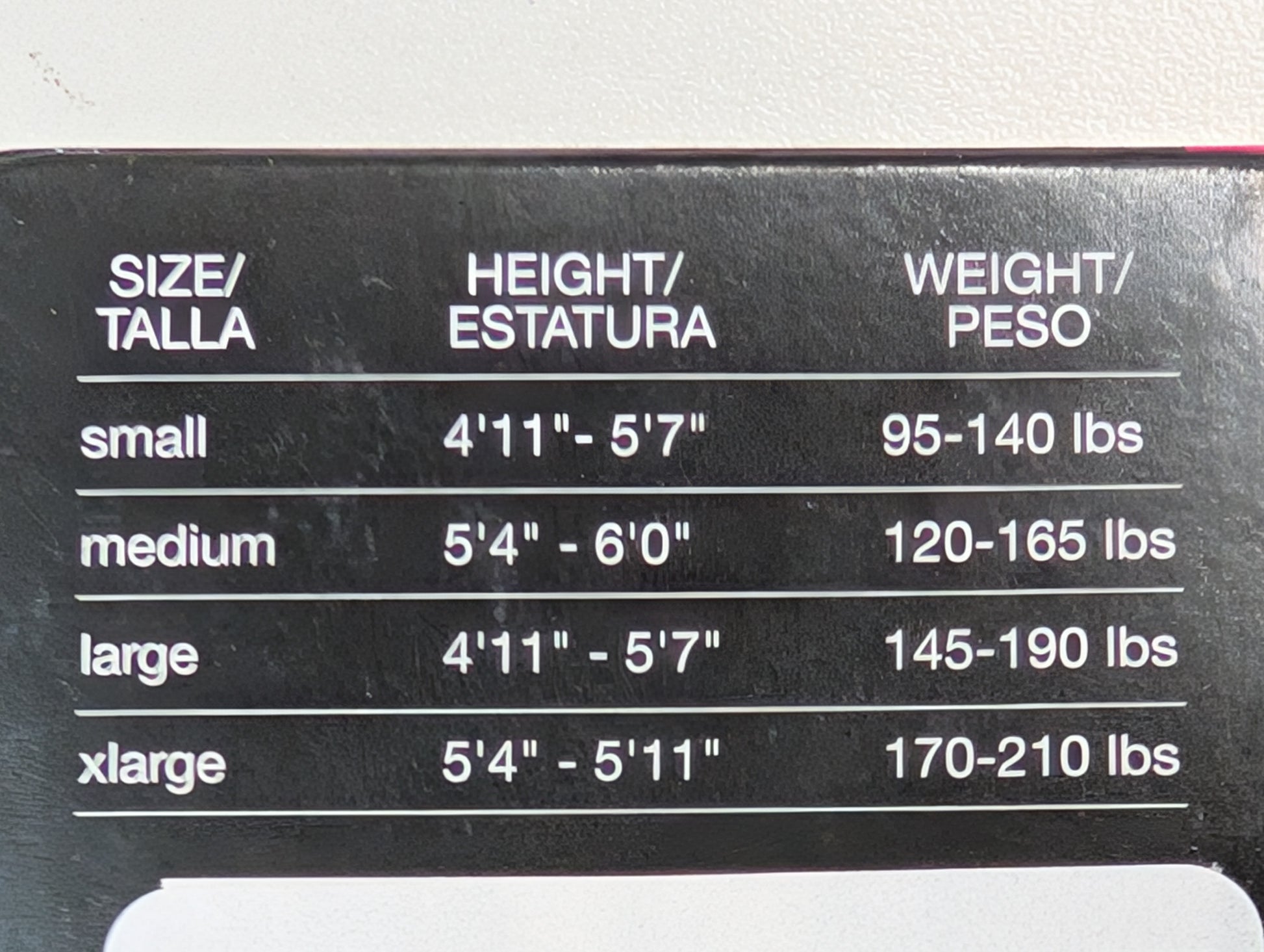 - Small = 4'11" - 5'7" and 95-140 lbs